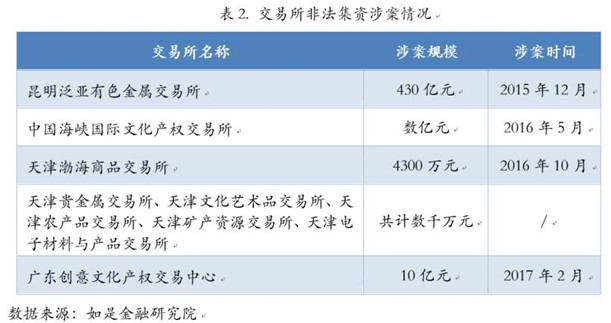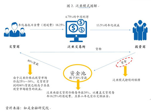 在交易所非法集资案件中,涉案规模和影响最大的是昆明泛亚有色金属交易所。昆明泛亚通过金属现货投资和贸易平台,自买自卖,操控平台价格,维持泛亚的价格比现货市场价高25%—30%,每年上涨约20%,制造交易火爆的假象,然后借此包装所谓“日金宝”等诱人的高收益产品。但实际上每年涨价20%只是为了让泛亚的价格永远高于现货市场价格,因此也永远不会有真正的买方,并没有带来实际增量资金;而交货商也因此不需补交保证金,投资者年化13.5%的日金宝理财收益,都是自己的本金或者新增投资者的本金。当新增资金放缓或者停止进入时,整个体系就会崩盘,投资者基本血本无归。泛亚模式就是利用新投资人的钱来向老投资者支付委托日金费和短期回报,制造赚钱的假象进而骗取更多的投资。2015年12月,昆明泛亚兑付危机爆发,涉及28个省份的22万人,非法集资金额总计超过430亿元,上千名泛亚投资者聚集在证监会门口集会抗议。