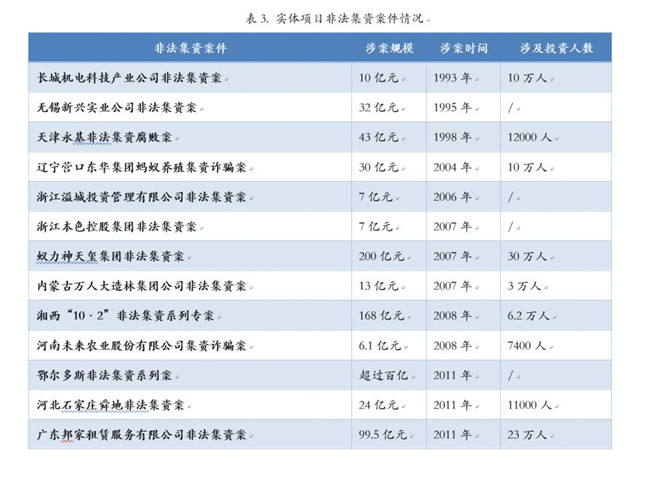 实体项目非法集资与前两种非法集资套路相似,只是投资标的不同。实体项目非法集资表面假借实体项目进行融资,但实体项目的资质往往是包装出来的,金玉其外败絮其中。实体项目非法集资具有案件多发、涉案规模大、涉及投资人数多的特点,曾经骇人听闻的蚁力神案、吴英案、小姑娘案、鄂尔多斯非法集资案等均在此列。